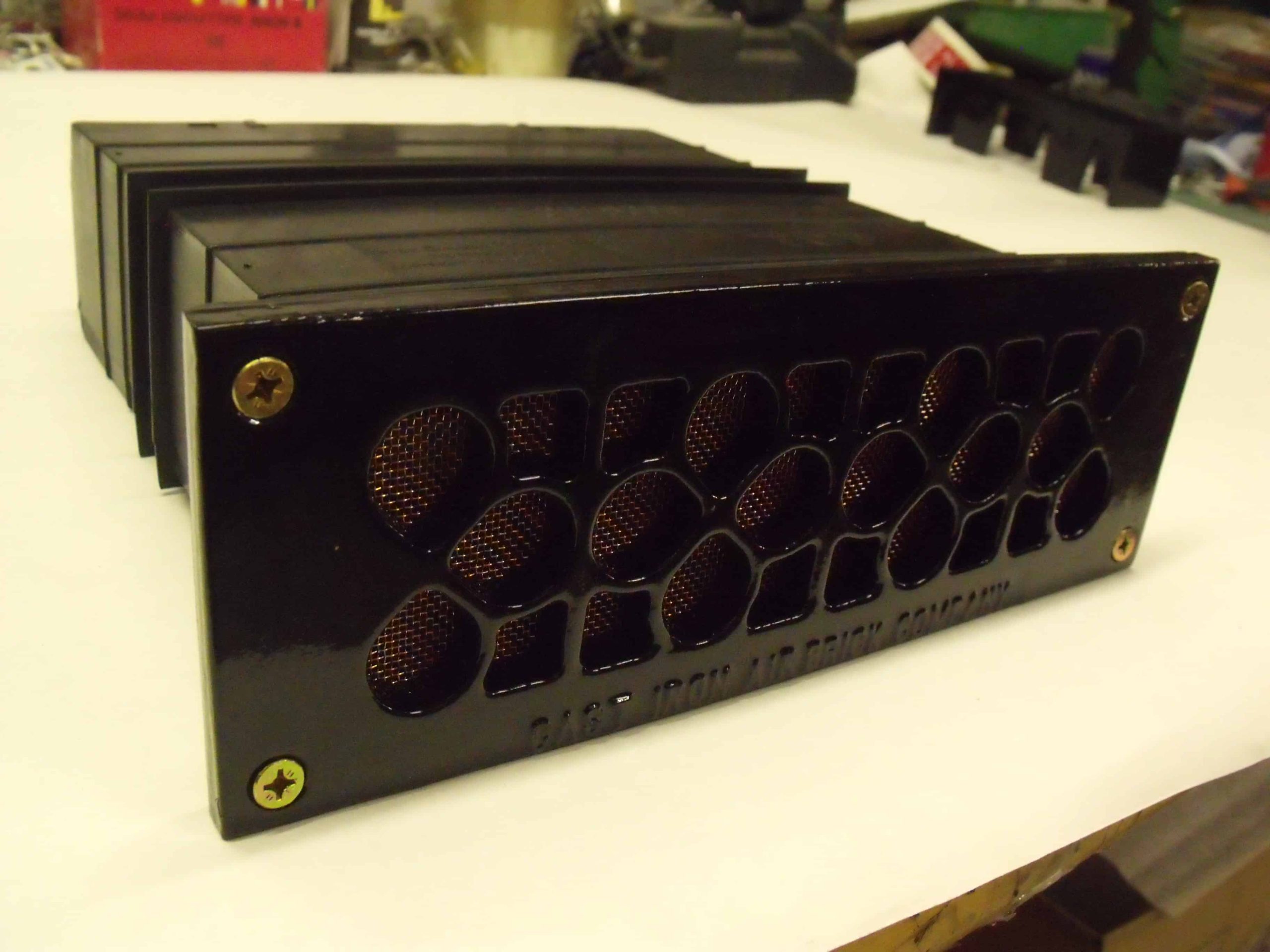 Daisy pattern drilled wall and floor vent painted black . Available from stock in single brick (10×4 inch) and double brick (10×7 inch)